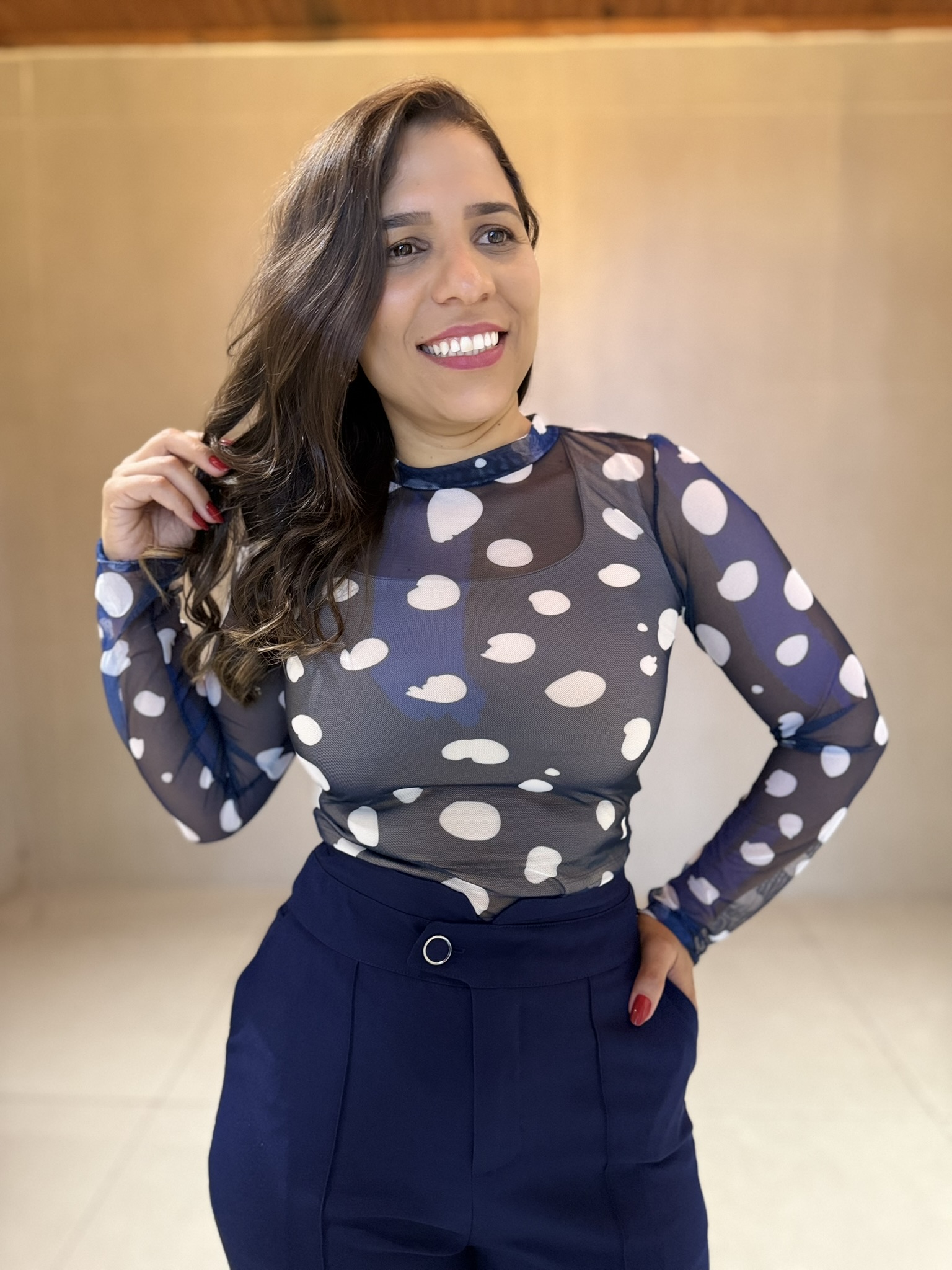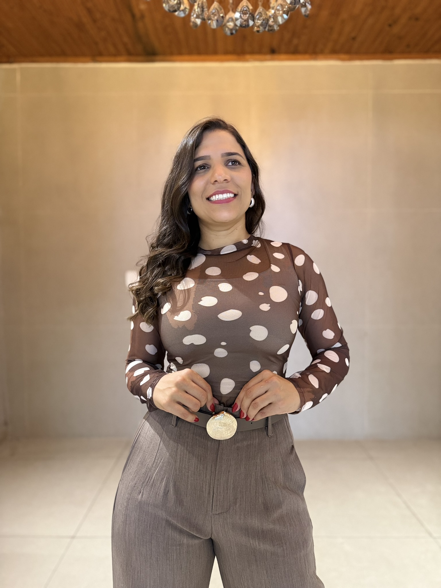 O Body Tule Poá Encanto é a peça perfeita para quem busca sensualidade com um toque delicado. Confeccionado em tule transparente com estampa de bolinhas (poá), ele valoriza o corpo com leveza e elegância. Possui caimento ajustado, destacando a silhueta de forma confortável. Ideal para compor looks ousados ou sofisticados, podendo ser usado tanto com peças de cintura alta quanto em produções noturnas.