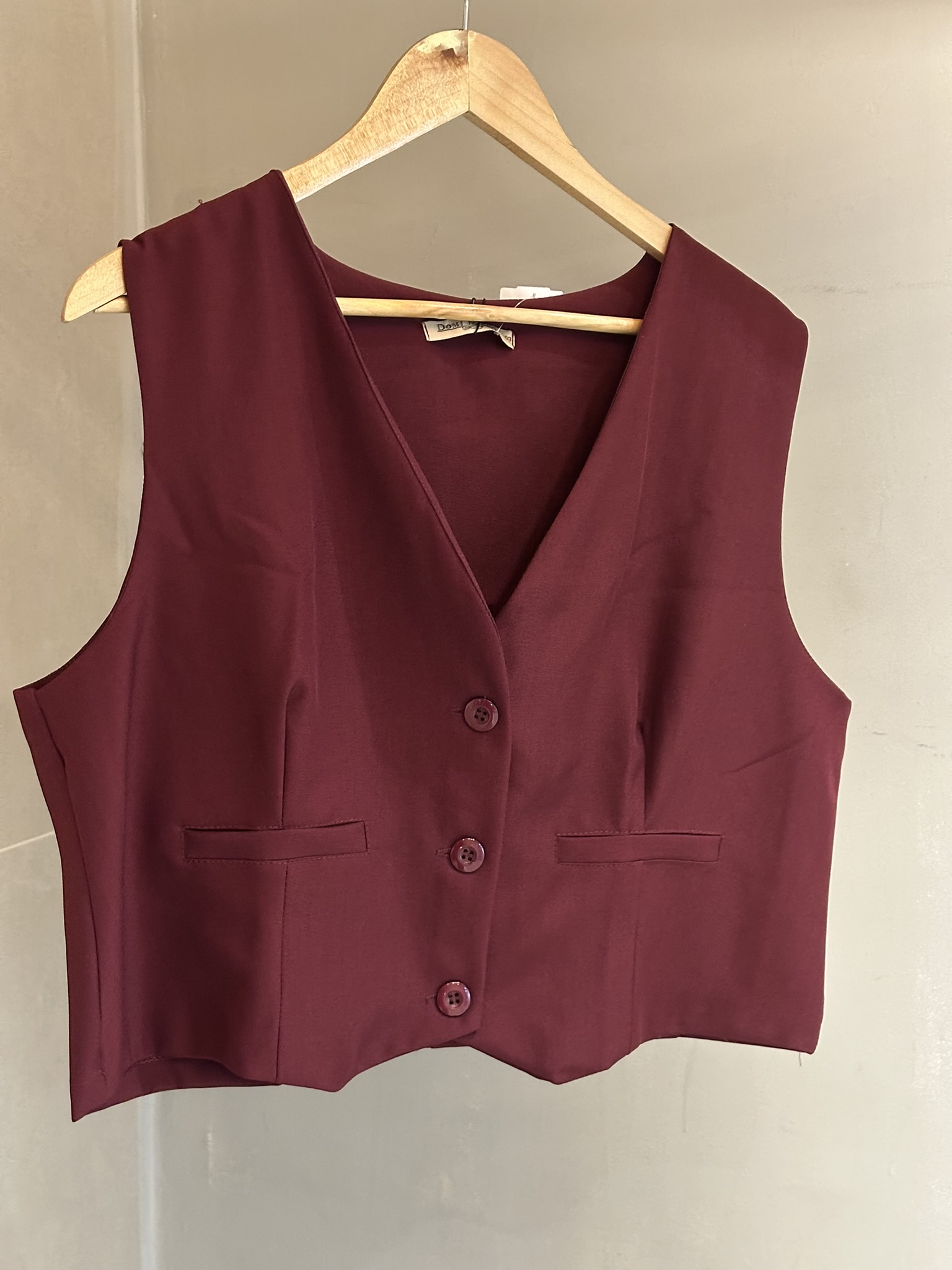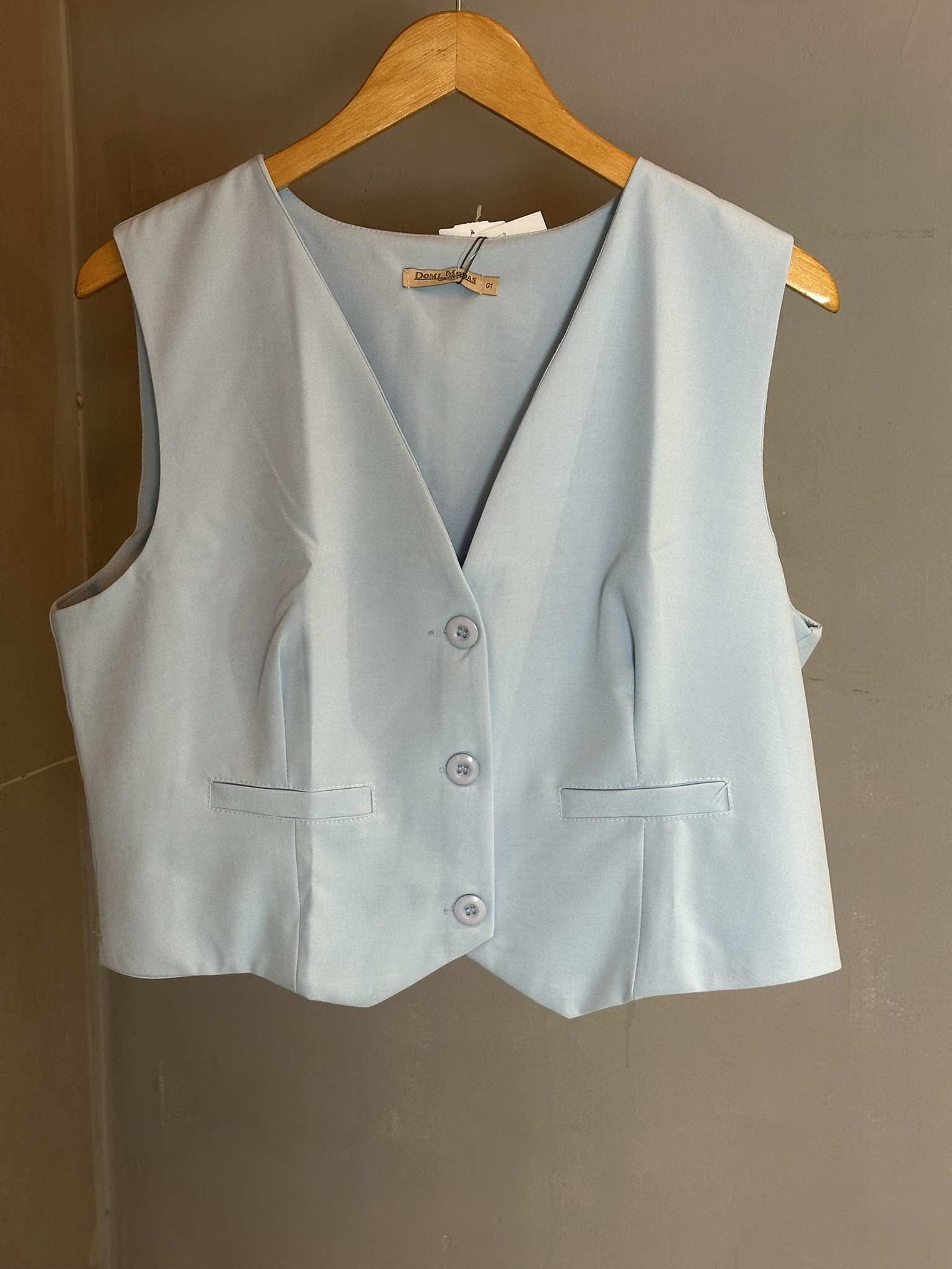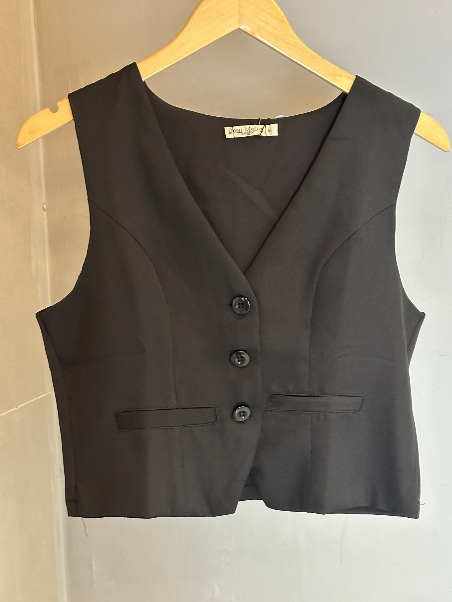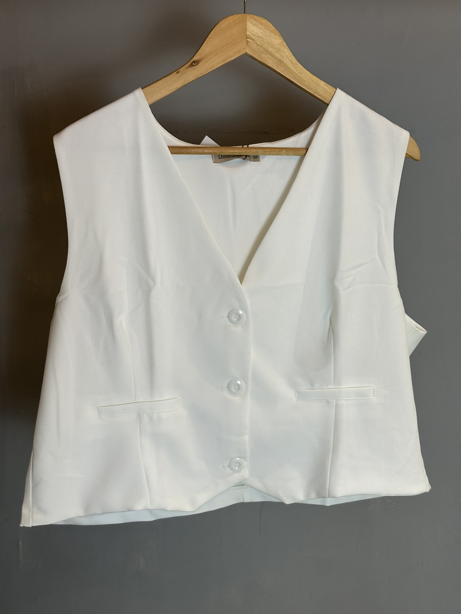 O colete apresentado é uma peça de vestuário feminina com um design elegante e minimalista. Ele possui as seguintes características: