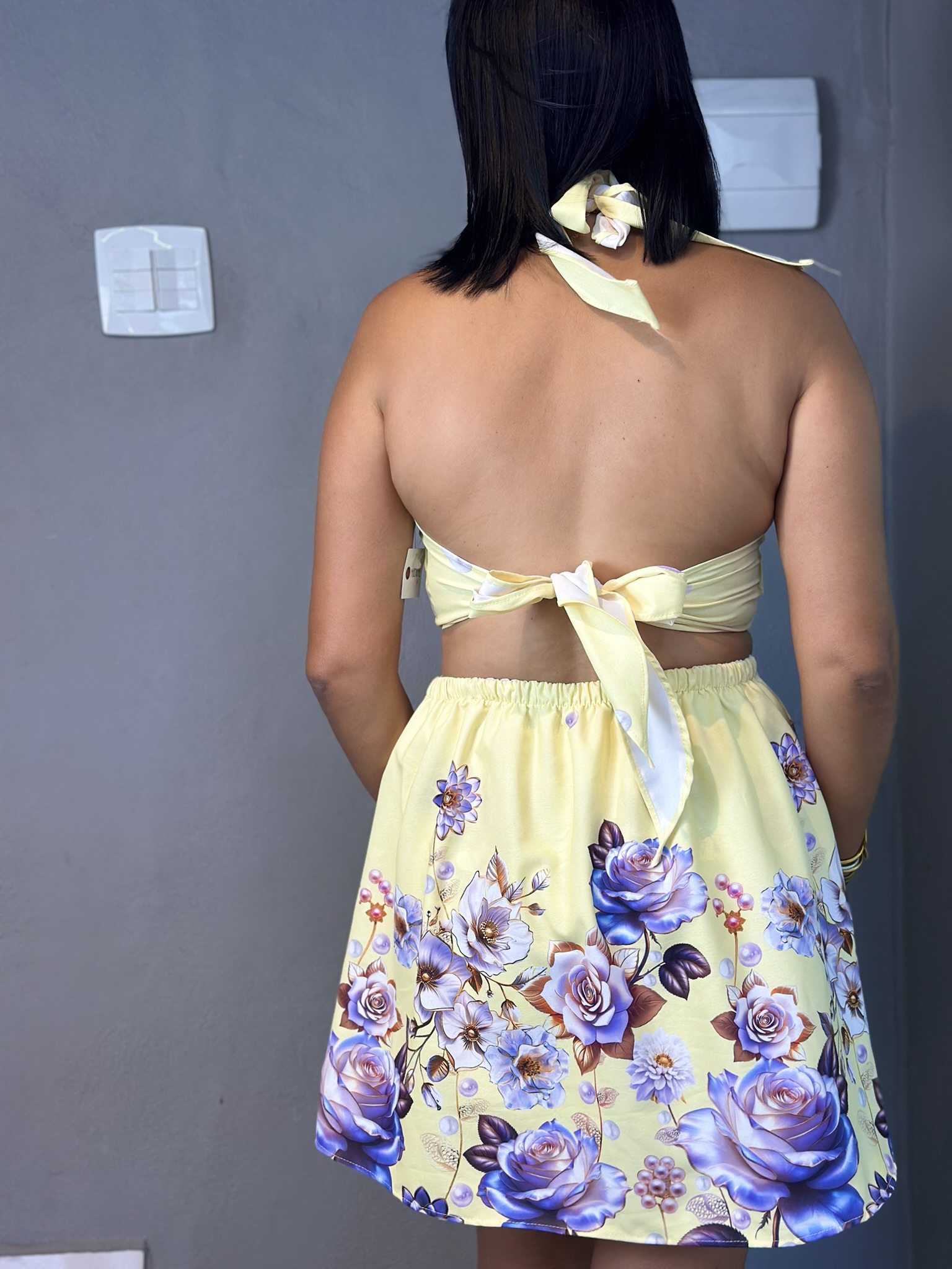Ele possui modelagem soltinha, que valoriza o corpo com conforto e fluidez. A parte superior é em tom neutro (off-white/nude claro), com um decote halter (gola alta) que alonga a silhueta e traz um toque sofisticado. O caimento na região do busto é levemente ajustado, destacando a parte de cima de forma elegante.
